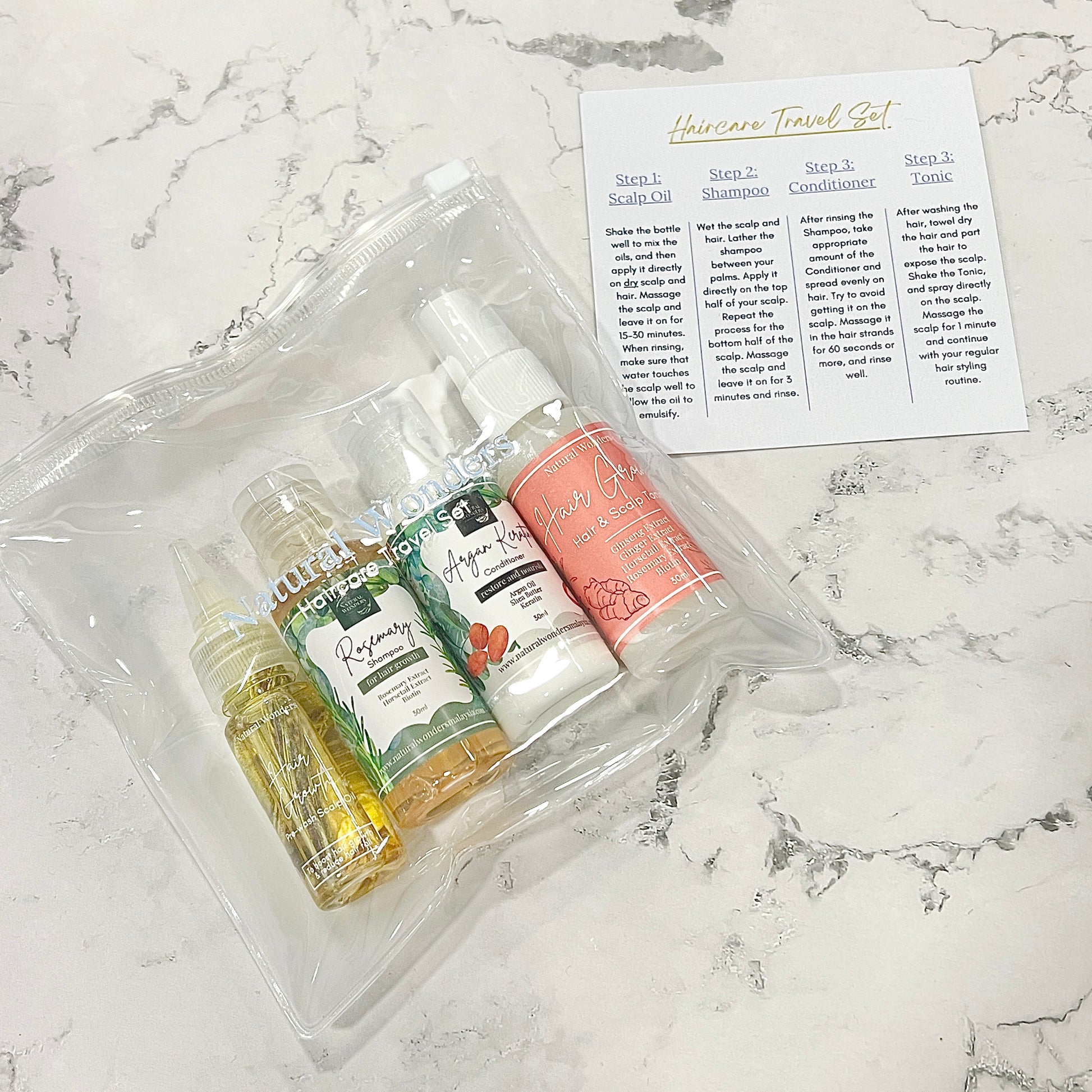 Take your favorite haircare products with you on your travels with our Haircare Travel Set! Comes in a cute clear waterproof pouch to make it easier for you to carry. :)
